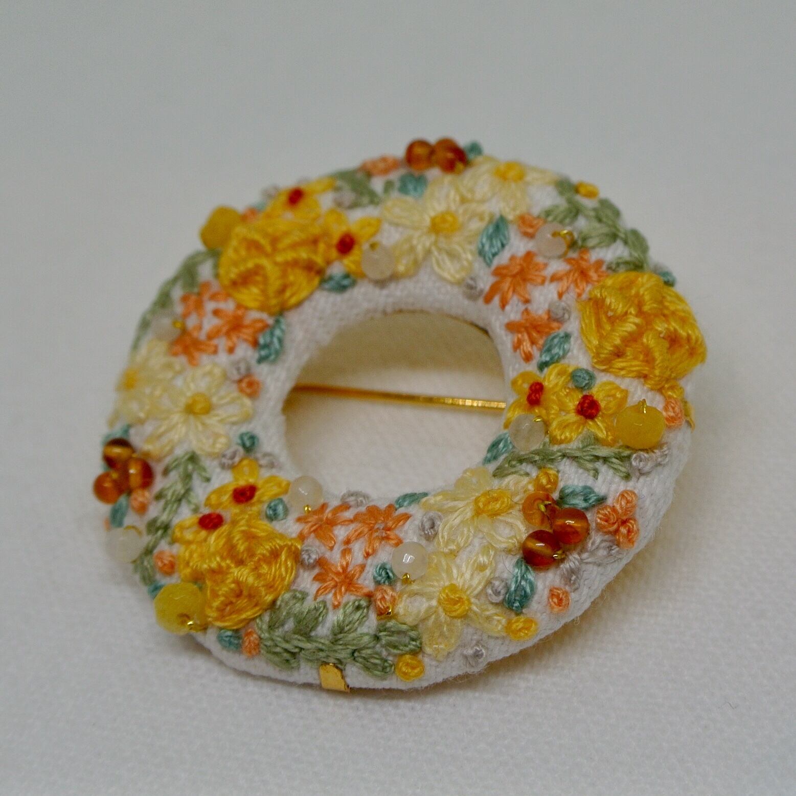 手刺繍で作りました、ドーナツ型のブローチです 直径は 約4cm 天然石の、カーネリアン、イエロージェード、ホワイトカルセドニーが散りばめられています。