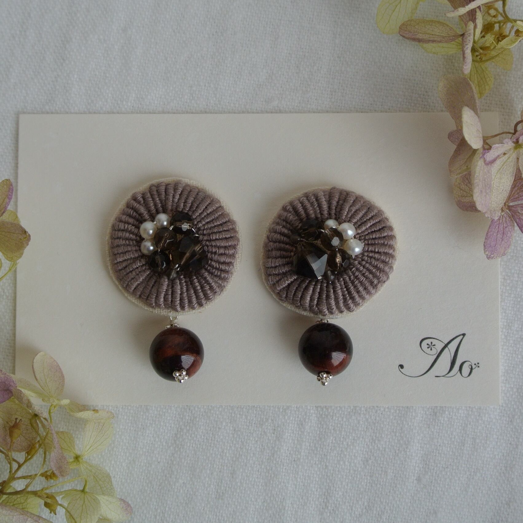 手刺繍に天然石を組み合わせたピアスです。