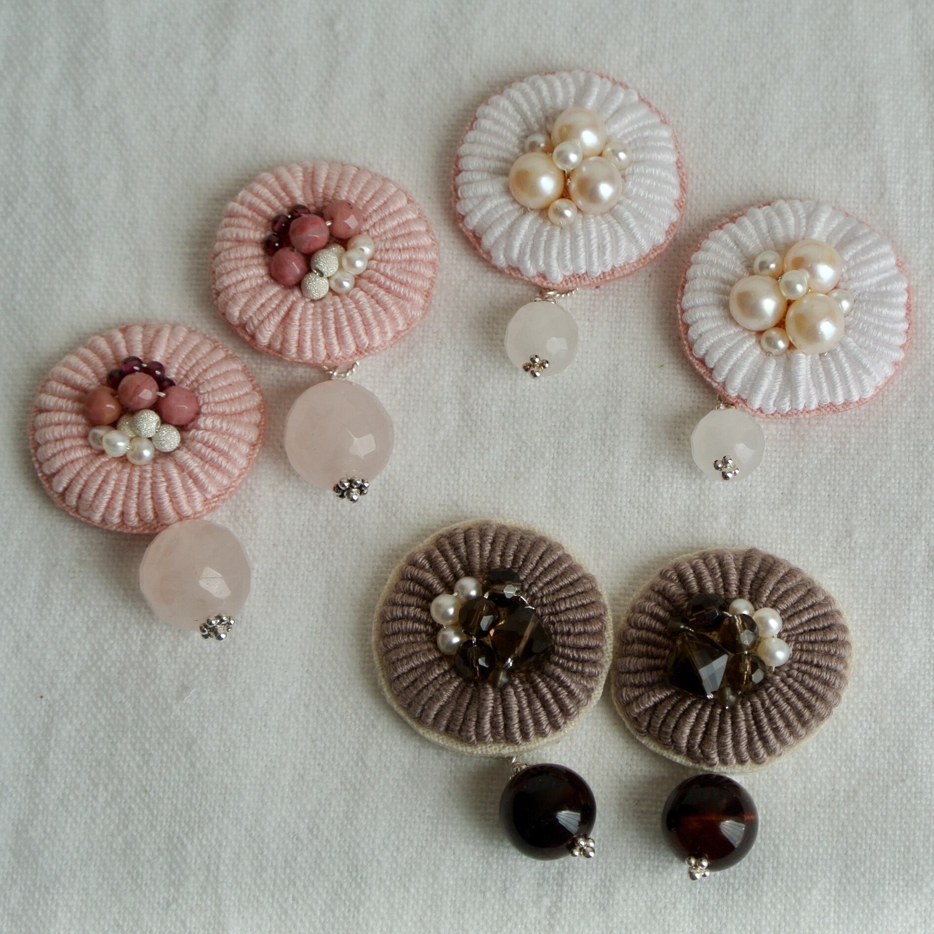 手刺繍と天然石、ピンク デイジーのピアス、ローズクオーツ