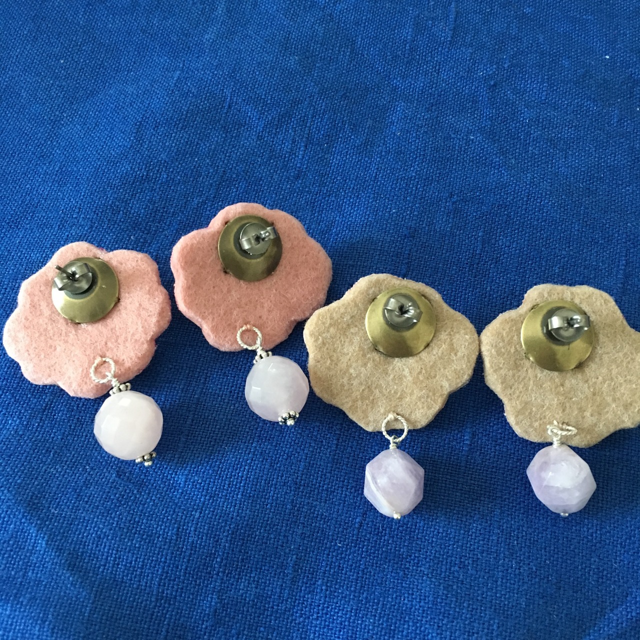 裏は厚めのフェルトを表から見えにくいように側面を斜めにカットし、ピアスパーツは、お顔に近い方に寄せて取り付けます。(裏の写真は一例にて、フェルトのお色は作品により違います)
