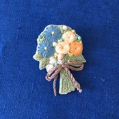 手刺繍 ブローチ ブルーデイジーとオレンジの薔薇のブーケ