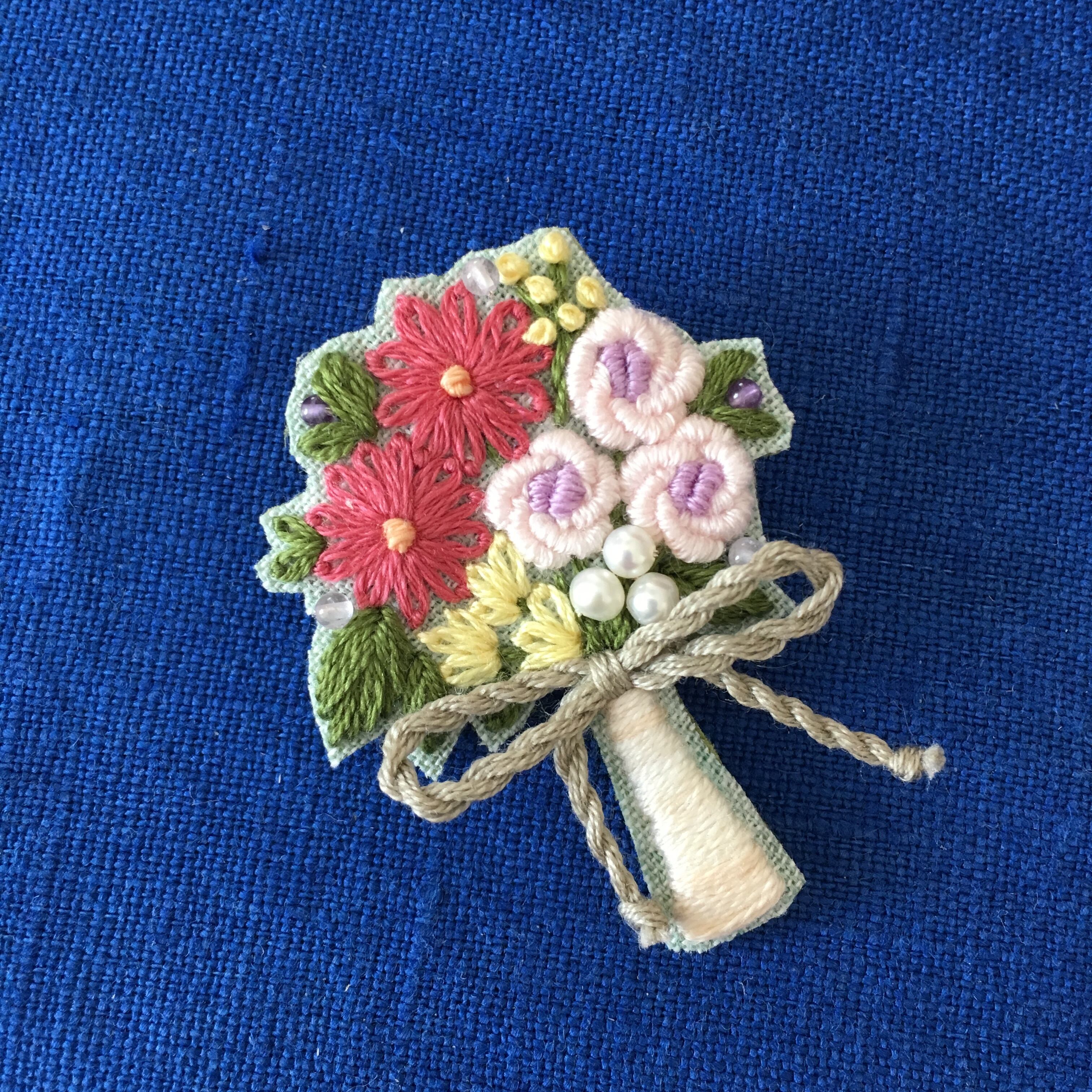手刺繍のブーケ 赤いデイジーに 薄いピンクの薔薇