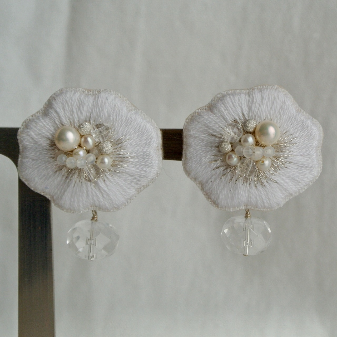 手刺繍と淡水パール、揺れる大粒クリスタルのピアス(イヤリング)ホワイト