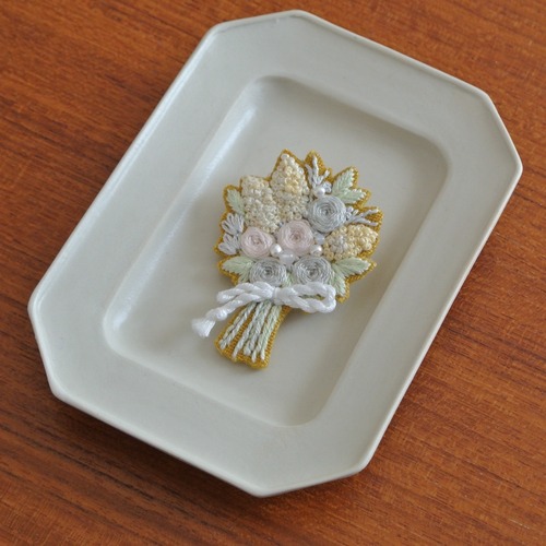 淡いピンク、グレー、イエローの糸を合わせたブーケ。台座はからし色にて、ヴィンテージフラワーをイメージしています。