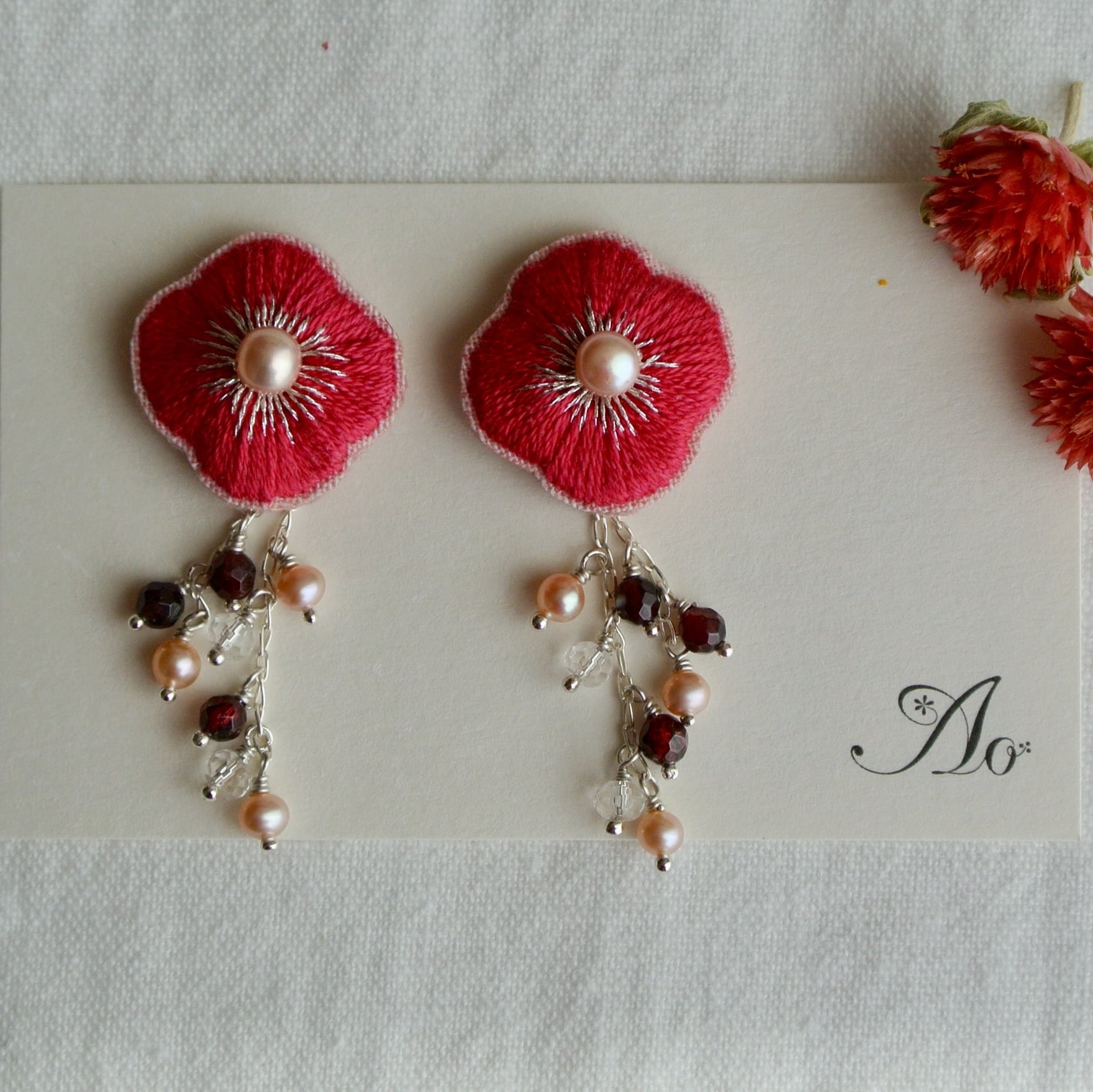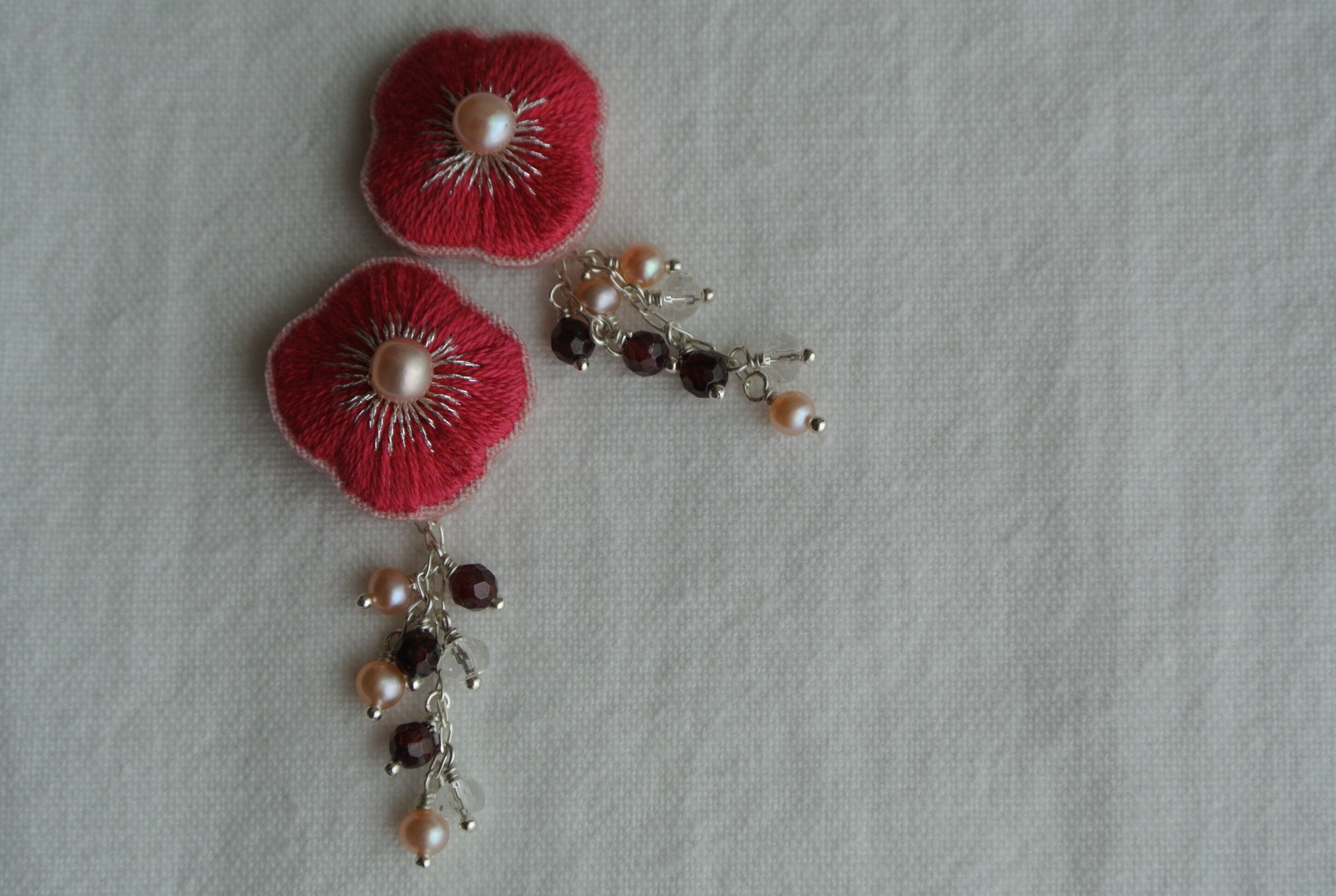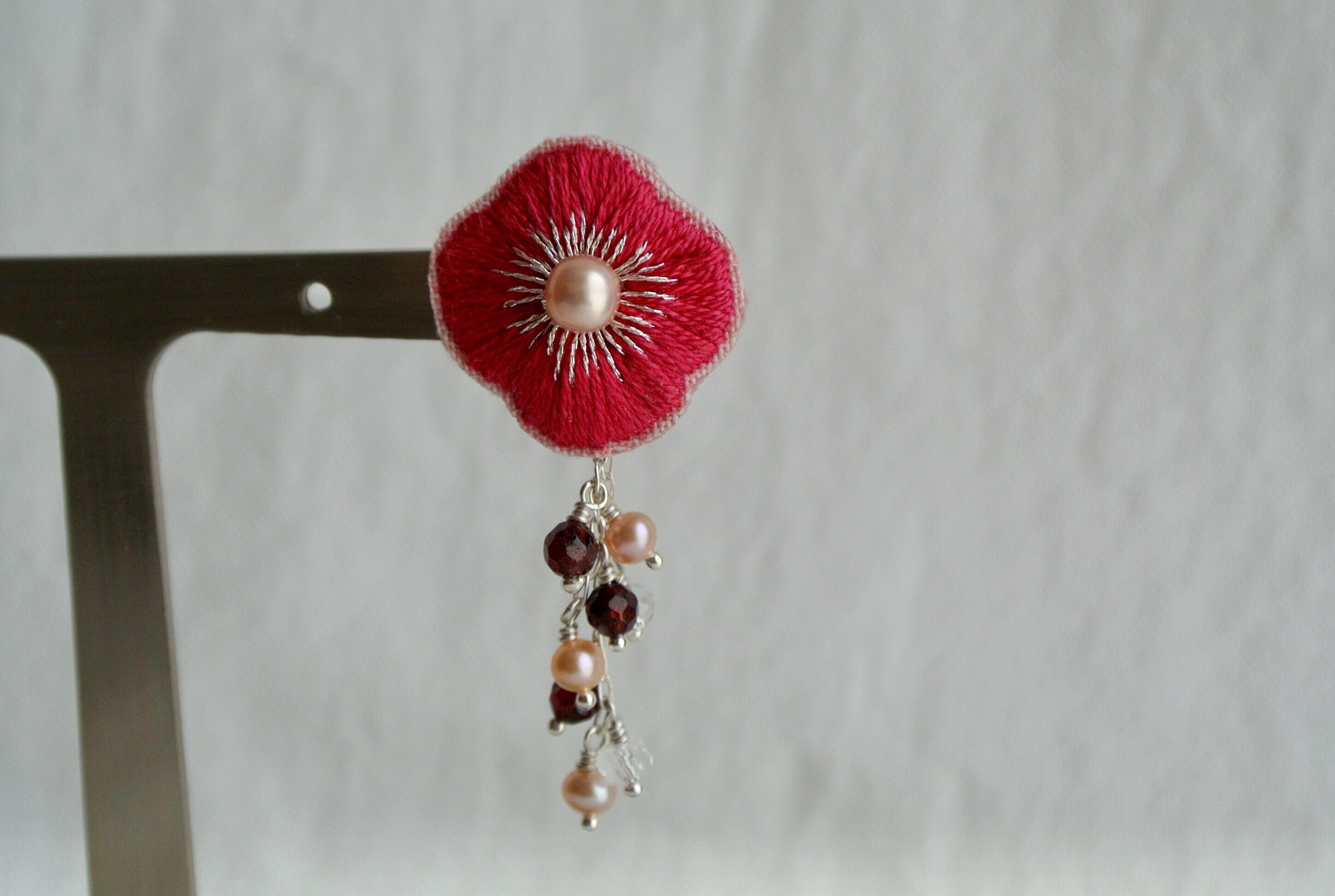 手刺繍と天然石の(イヤリング)パッションピンク淡水パール。シルバー925フリンジピアス