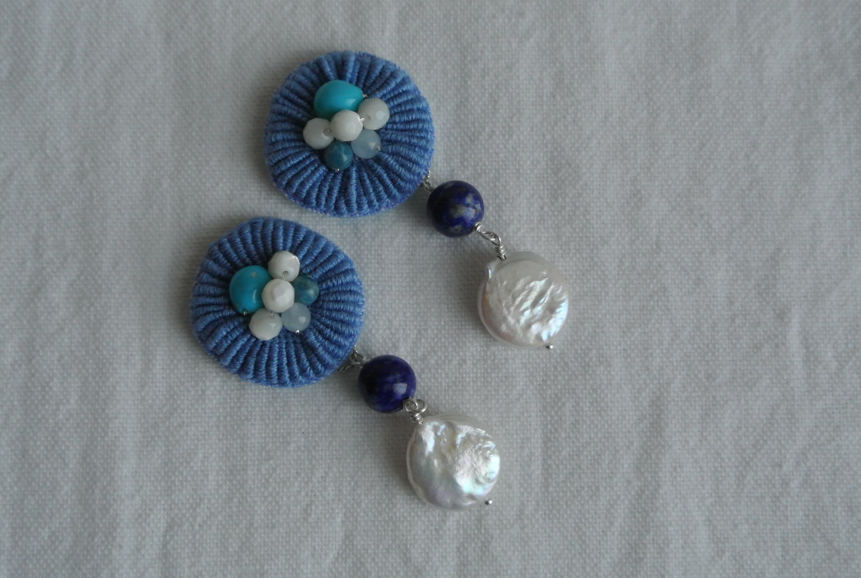 手刺繍と天然石、ブルー デイジーのピアス(イヤリング)ターコイズ ラピス 淡水パール