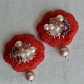 手刺繍と天然石、赤いアネモネのピアス(イヤリング)淡水パール